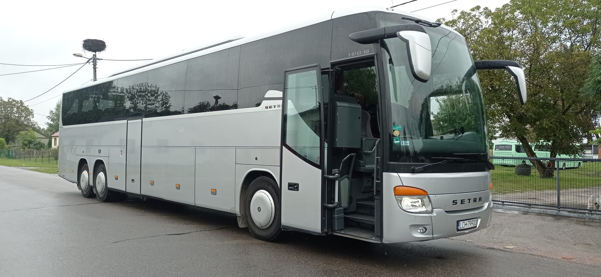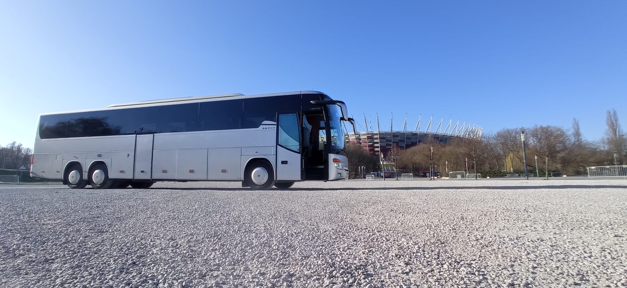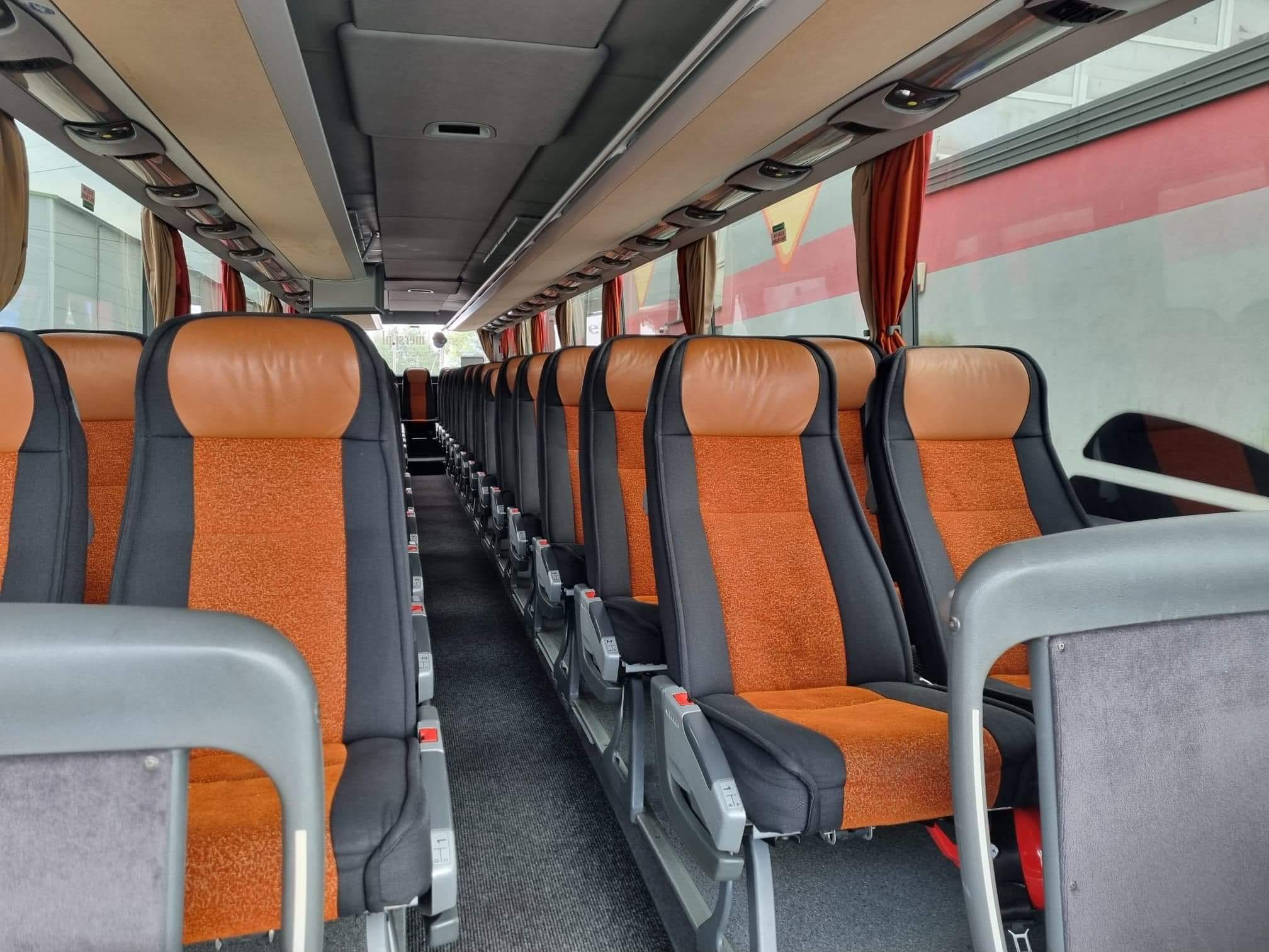 Setra autobus. Ilość miejsc 55+1+1. Wyposażenie : klimatyzacja, rozkładane fotele, DVD, WC, pasy bezpieczeństwa, przyciemniane szyby, gniazdka.