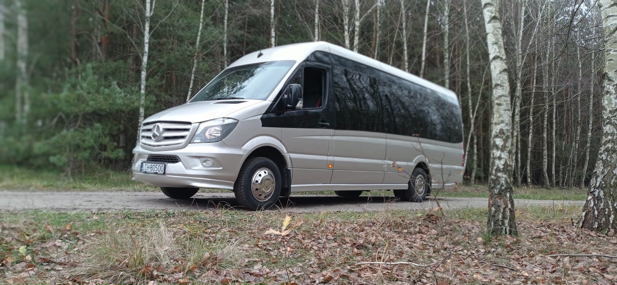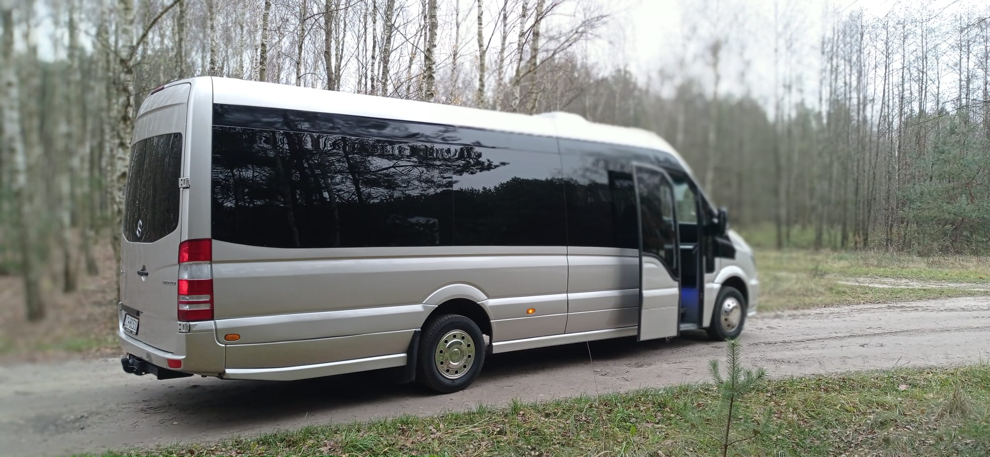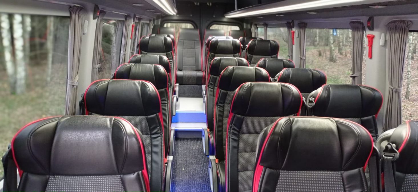 Mercedes-Benz Sprinter. Ilość miejsc 23+1. Wyposażenie: klimatyzacja, rozkładane fotele, pasy bezpieczeństwa, przyciemniane szyby, DVD, lodówka.